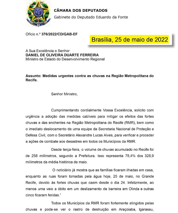 O ministro do Desenvolvimento Regional, Daniel Ferreira, atendeu a solicitação feita pelo deputado federal Eduardo da Fonte (Ofício 376) na última quarta-feira (25), e garantiu que irá enviar uma equipe técnica da Defesa Civil para monitorar os municípios e áreas afetadas pelas fortes chuvas em Pernambuco. O grupo chegará ao Recife neste domingo (29).